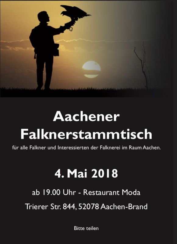 Der LV NRW läd recht herzlich alle FalknerInnen und Interessierten zu einem Falknerstammtisch am 04.05.2018 in Aachen ein. Weitere Informationen entnehmen Sie bitte dem Flyer: